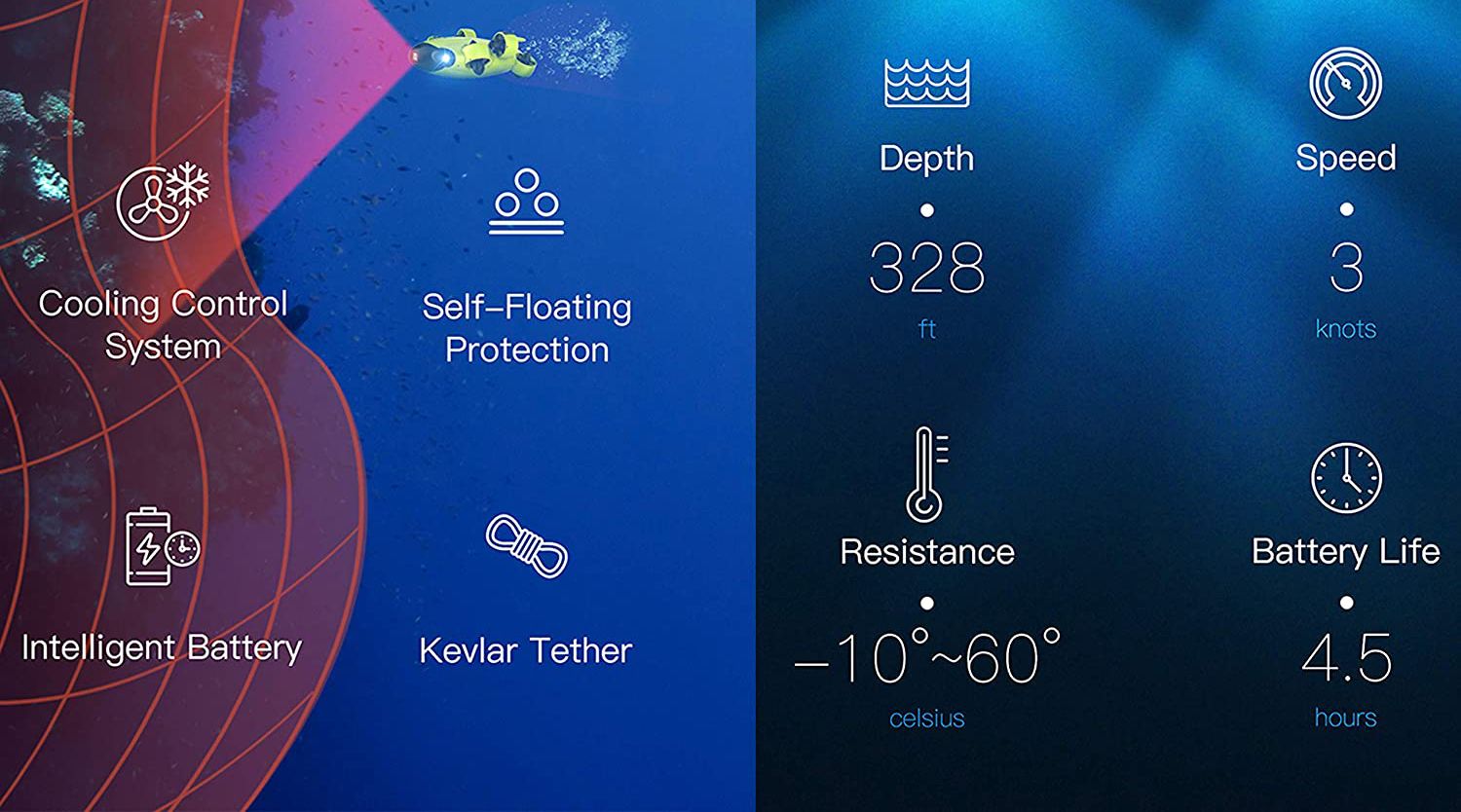 Le Madfish est un robot sous-marin conçu pour être utilisé dans un environnement industriel. Il peut être employé pour effectuer des inspections jusqu'à une profondeur de 100 mètres. Grâce à ses caméras haute résolution en couleur (4K UHD 30fps), ce MINI-ROV est capable de fournir des images de qualité supérieure. Alimenté par ses batteries intégrées, il offre une autonomie de 4,5 heures pour 1 heure rechargement.